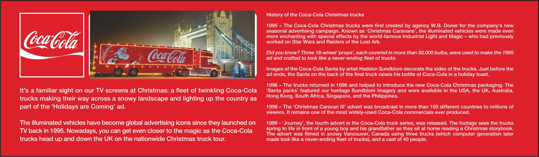 It's a familiar sight on our TV screens at Christmas: a fleet of twinkling Coca-Cola trucks making their way across a snowy landscape and lighting up the country as part of the 'Holidays are Coming' ad. The illuminated vehicles have become global advertising icons since they launched on TV back in 1995. Nowadays, you can get even closer to the magic as the Coca-Cola trucks head up and down the UK on the nationwide Christmas truck tour.