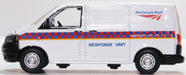 The very modern VW T5 plays a vital part as a small commercial van and it makes its entrance as used by Network Rail in 2014, registered BJ64 AXF. It is decorated in the clean contemporary livery of Network Rail and is an ideal accessory for a modern 00 gauge railway layout as well as appealing to small commercial van enthusiasts per se. Its livery sees it in a Response Unit role and its bright red and blue chequered waistband and red/yellow diagonal decoration across the back doors certainly ensure it is noticed. In contrast to the bright exterior, the interior is completely black, as are the bumpers and chassis.